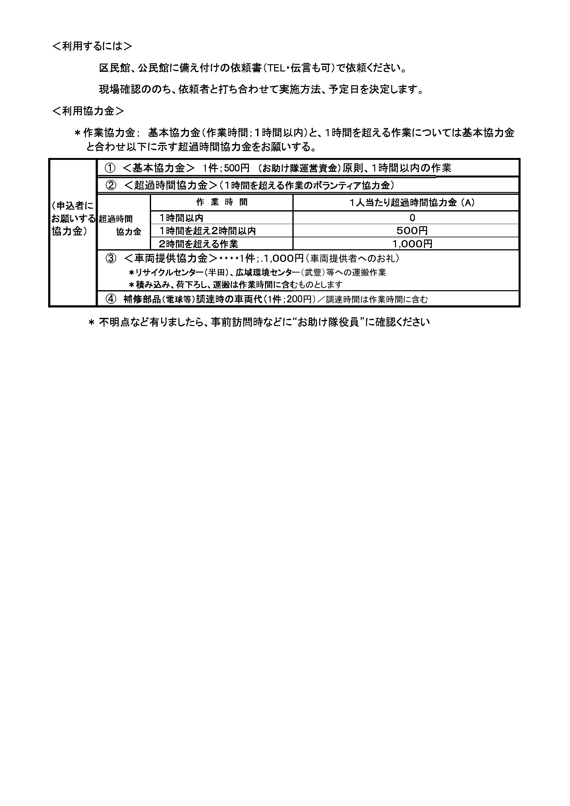 おたすけ隊の依頼方法と発生する費用の説明です。