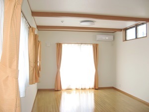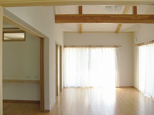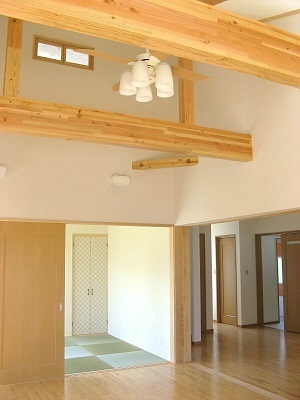― 大きな梁と吹き抜けと勾配天井 ダイナミックなリビングのある家ー