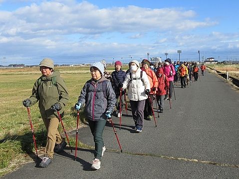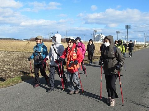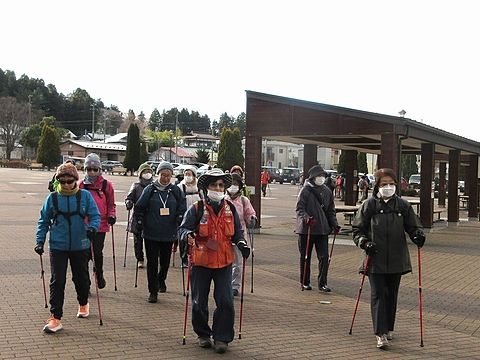 晴天の白山台公園、本日は早春の櫛引八幡宮を目指します。準備体操の後3チームに分かれて出発。高専の桜並木を眺めて里道を下ると、穏やかに流れる坂牛川と田植え前の水田が広がり、畦道を進むと間もなく櫛引八幡宮に到着。皆さん思いを込めて参拝。帰路は川沿いの果樹園や付近住宅の花々、ウグイスの囀りなど楽しみながら無事ゴールインしました。